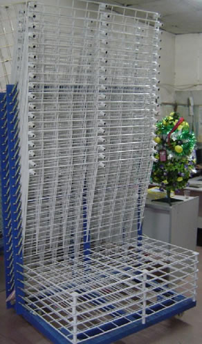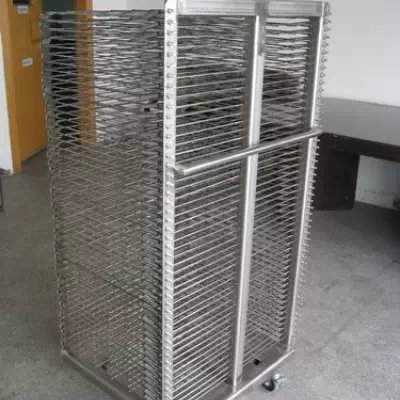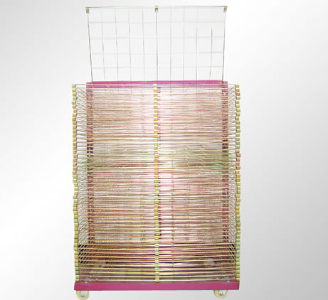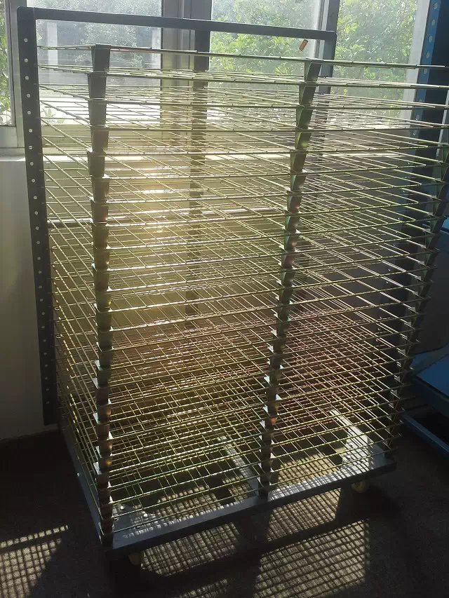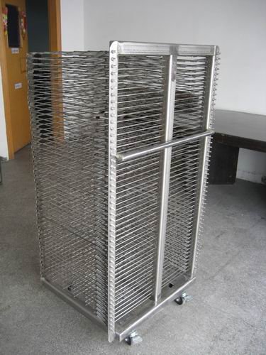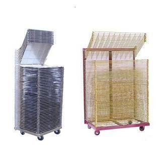 千层架,又叫丝印千层架、乾燥架、千层车、晾晒架、晾纸架、网架、层架台车。适用于印刷、上胶、喷漆、上色,溅镀後的晾乾置放器材。活动式多层网格设计,置放空间大,操作方便,节省车间、库房面积,并可适用於所放产品的常温晾乾和进焗炉高温烘烤。